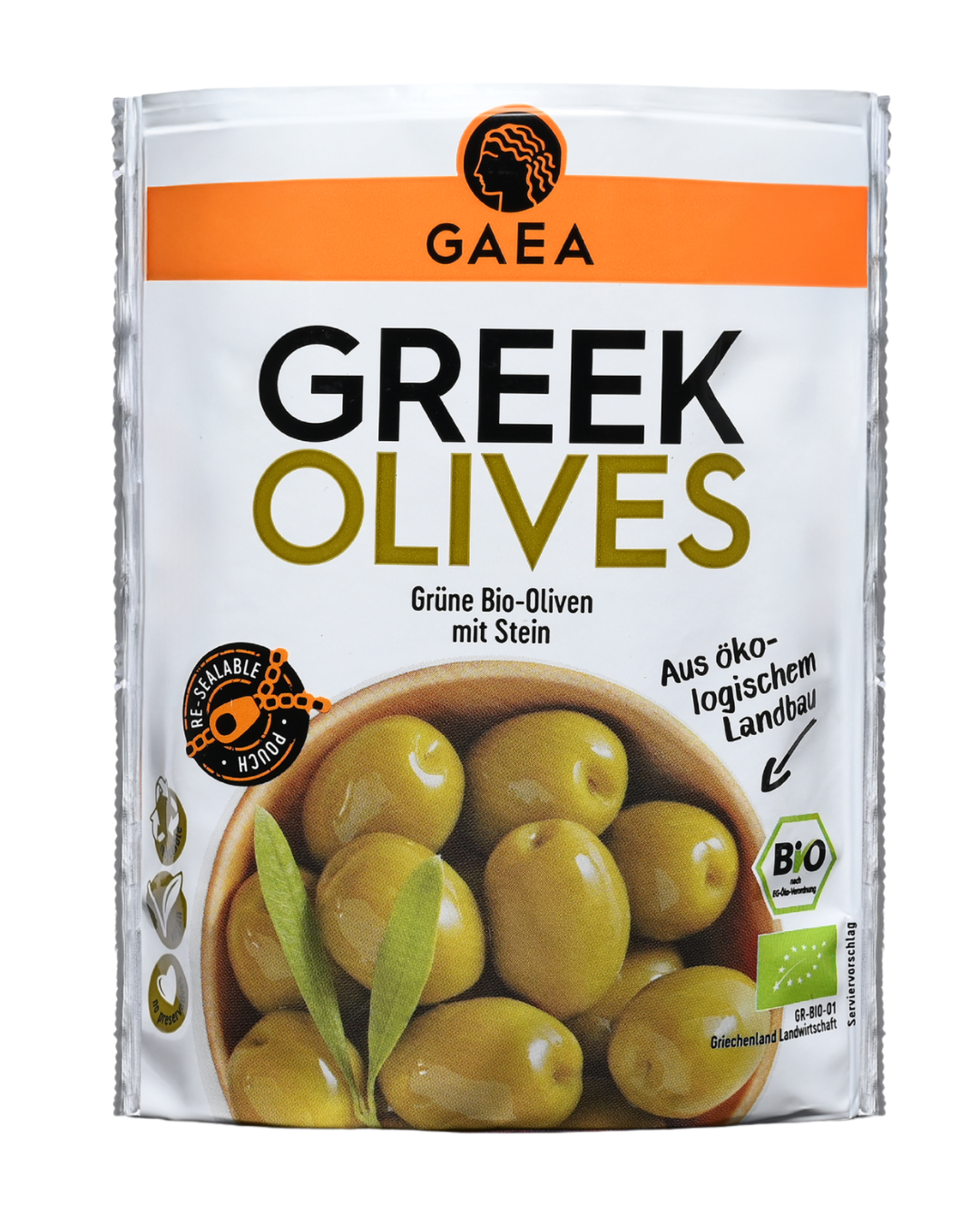 Von Hand geerntete Bio-Oliven aus Chalkidiki, mariniert in nativem Olivenöl Extra – ohne Flüssigkeit, ohne Konservierungsstoffe, im praktischen Frischepack.